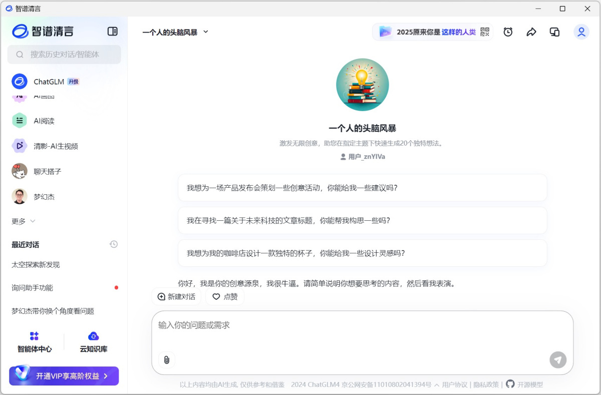 智谱清言,拥有千亿参数对话模型,支持多轮对话,具备内容创作、信息归纳总结等能力。基于ChatGLM中英双语大模型开发,通过万亿字符的文本与代码预训练,结合有监督微调技术,具备通用问答、多轮对话、创意写作、代码生成、虚拟对话、AI画图、文档和图片解读等能力。期待成为你的得力助手,无论在工作、学习,还是日常生活中我们都一直陪伴你。