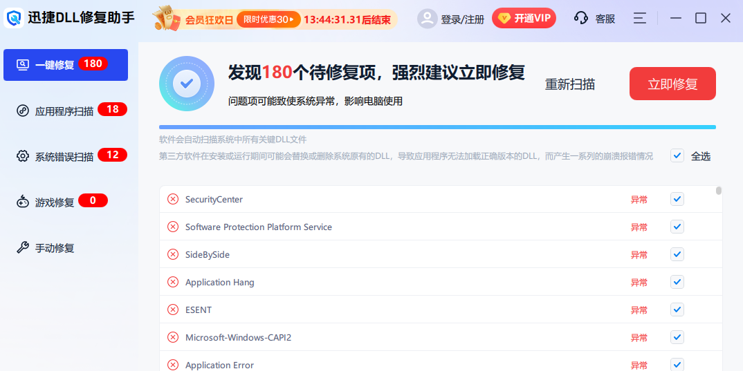 迅捷DLL修复助手可以快速扫描并定位因DLL文件缺失或损坏带来的问题,帮助用户一键修复,为用户提供高性能的系统操作环境。