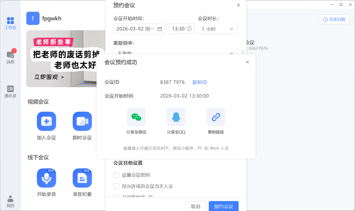 步骤2、可以在此设置会议名称、会议内容和更多其他设置,设置完成后点击【预约会议】。