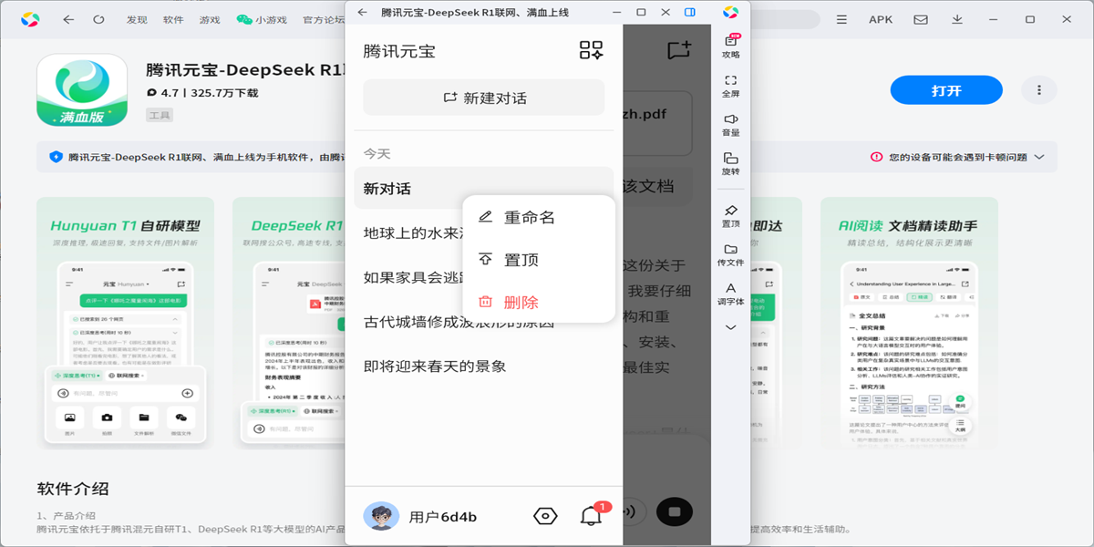 (此软件包中包含安卓模拟器)依托于腾讯混元自研T1、DeepSeek R1等大模型的AI产品