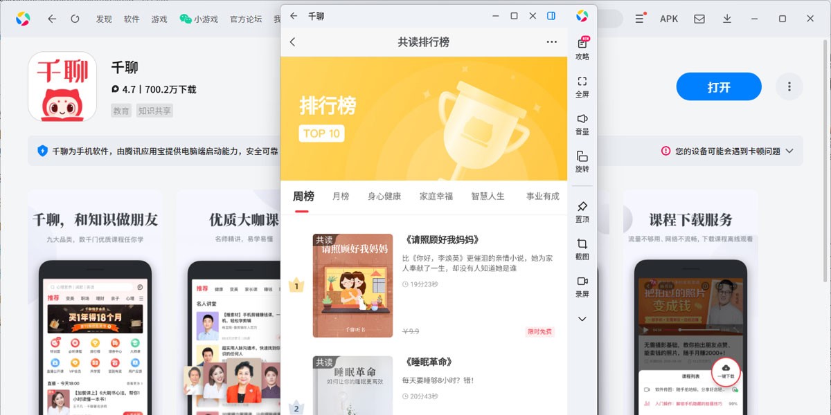 千聊是一款能为用户提供海量精品课程、热门经典解读和共读、笔记学习社区等知识服务软件,我们的使命:成为国内领先的家庭和个人成长知识服务平台和学习品牌。专注于知识分享和在线教育的平台,提供直播、录播、图文等多种形式的内容,涵盖教育、职场、生活等领域。用户可以通过手机或电脑参与课程学习。
