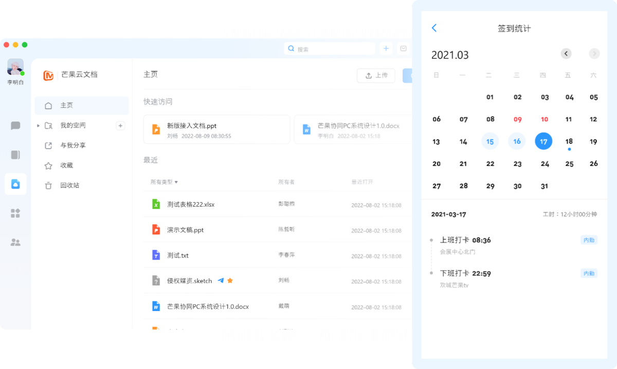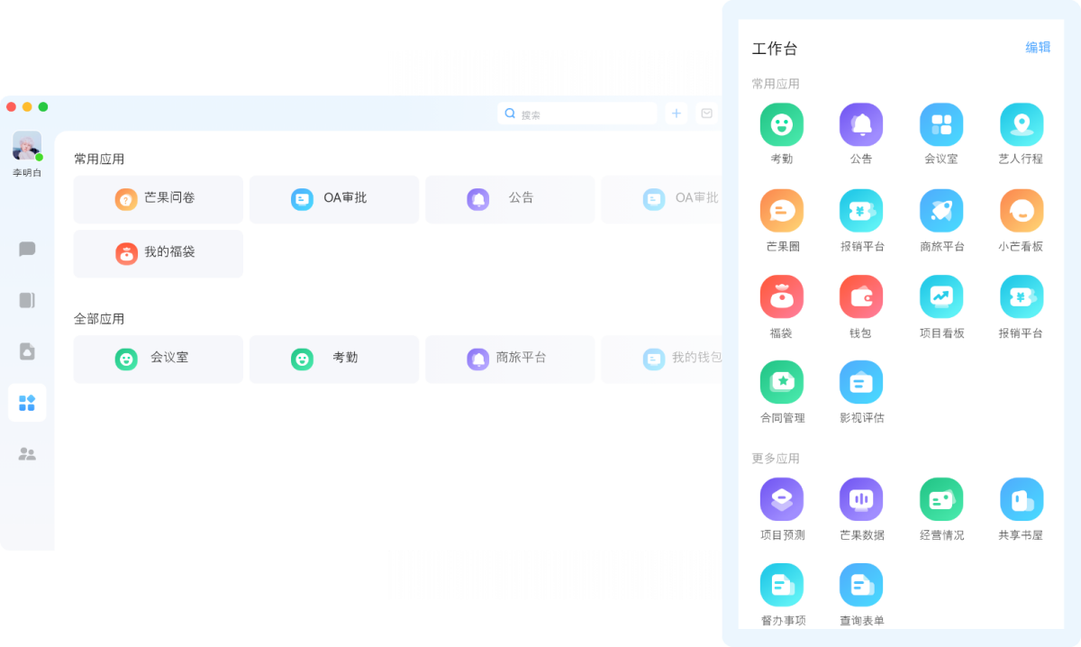 在芒是由芒果TV自主开发的协同办公系统,帮助企业快速实现在线沟通、移动办公,提升工作效率与质量。在芒实现OA与私有化、公有化系统的无缝融合,不管是与ERP、CRM、财务等系统,还是商旅等应用及服务平台,都能轻松实现充分的连接,进而构造OA+商旅、OA+会议、OA+报销等多场景应用。整合多方资源,打通内外协作,融合AI大数据等新技术、构建数字化、智能化的组织协同模式,实现芒果信息化的有效整合与跨组织的无边界协同。