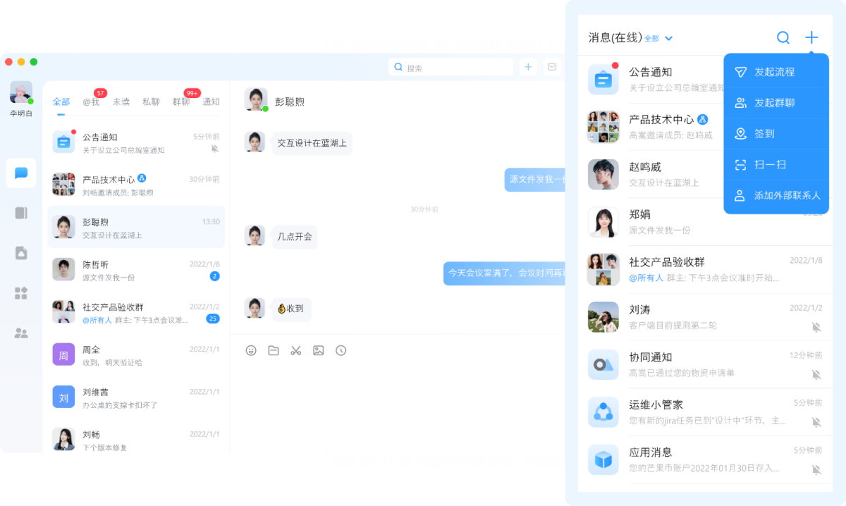 会话信息通知、业务信息推送、多种形式实时提醒,考勤、流程审批、通知新闻、会议管理、内部邮件,随时随地办公