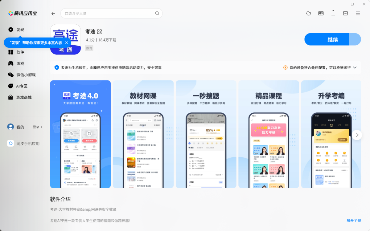 在小杜下载站下载最新安装包,按提示先安装应用宝电脑版(已安装会直接调用打开,未安装应用宝时,手机APP无法独立在电脑上运行),然后在应用宝里安装软件,安装好后,直接打开登录就能使用了。