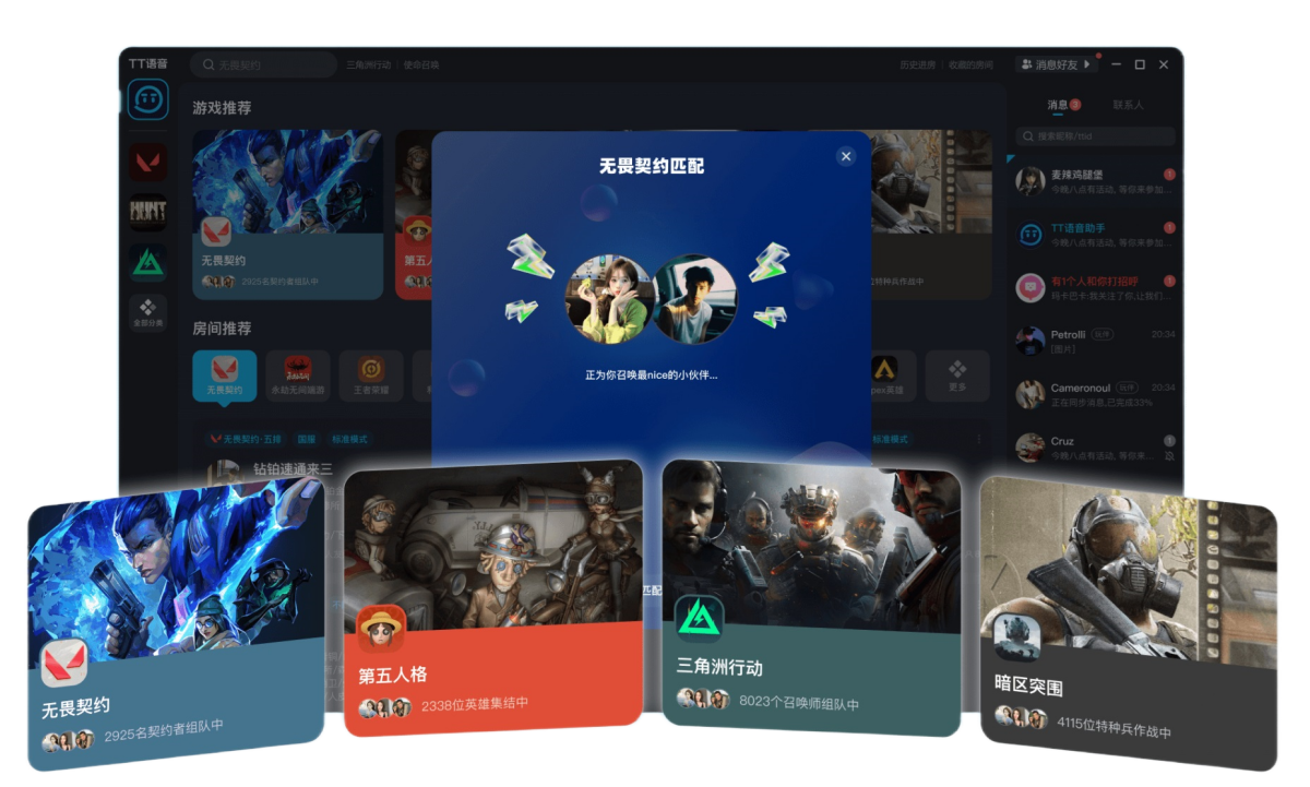 TT语音,以游戏互动为主的兴趣社交平台,超1亿年轻人都在用!为你提供组队开黑、线上K歌、玩伴扩列等时下流行的社交组局玩法~上TT,随时有玩伴!