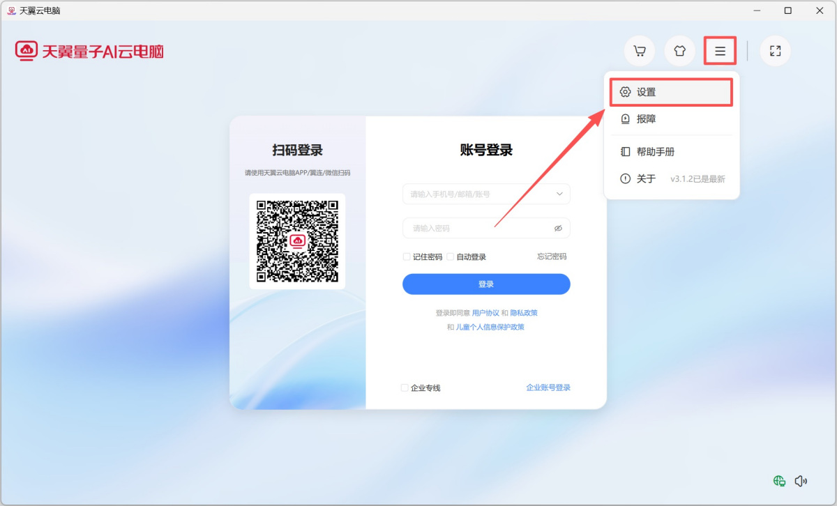 1、打开投屏接收端设备的天翼云电脑客户端,在登录页面点击右上角【≡】图标,选择【设置】