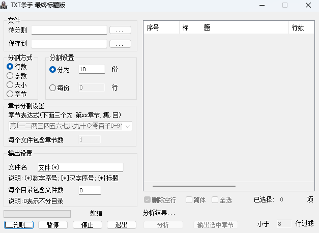 TXT杀手是专门为热爱小说的朋友们推出的文本分割软件,其支持ANSI格式编码,可以选择按照章节、行数、字数、大小分割,按大小分割的时候可以分割任意类型的文件,可以当作万能分割工具使用,多线程,分割速度快。