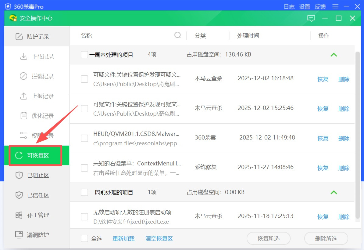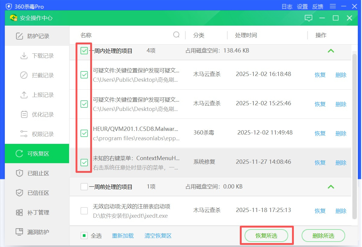 步骤4、若需要批量恢复,勾选文件左侧方框后,再点击下方【恢复所选】即可