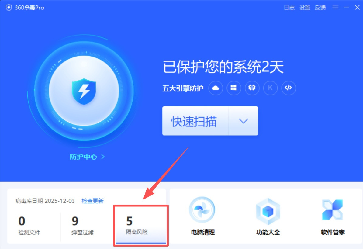 步骤1、打开360杀毒软件,点击主界面的左下角的【隔离风险】