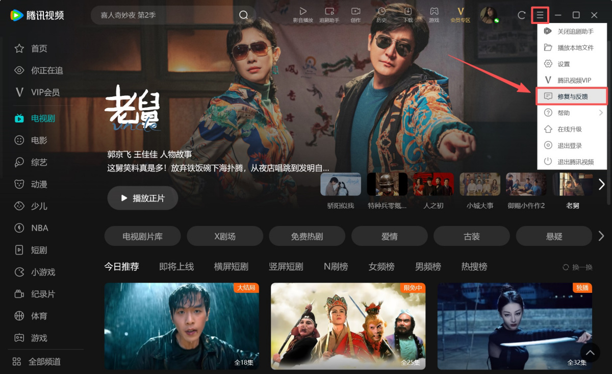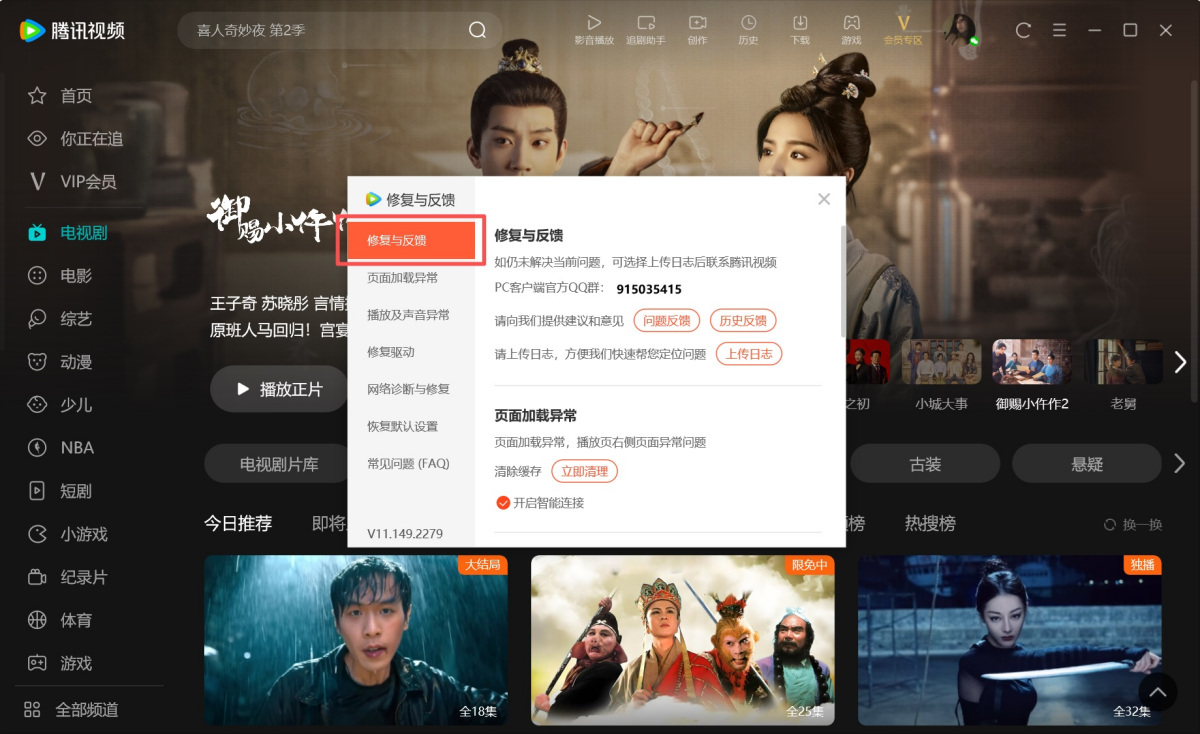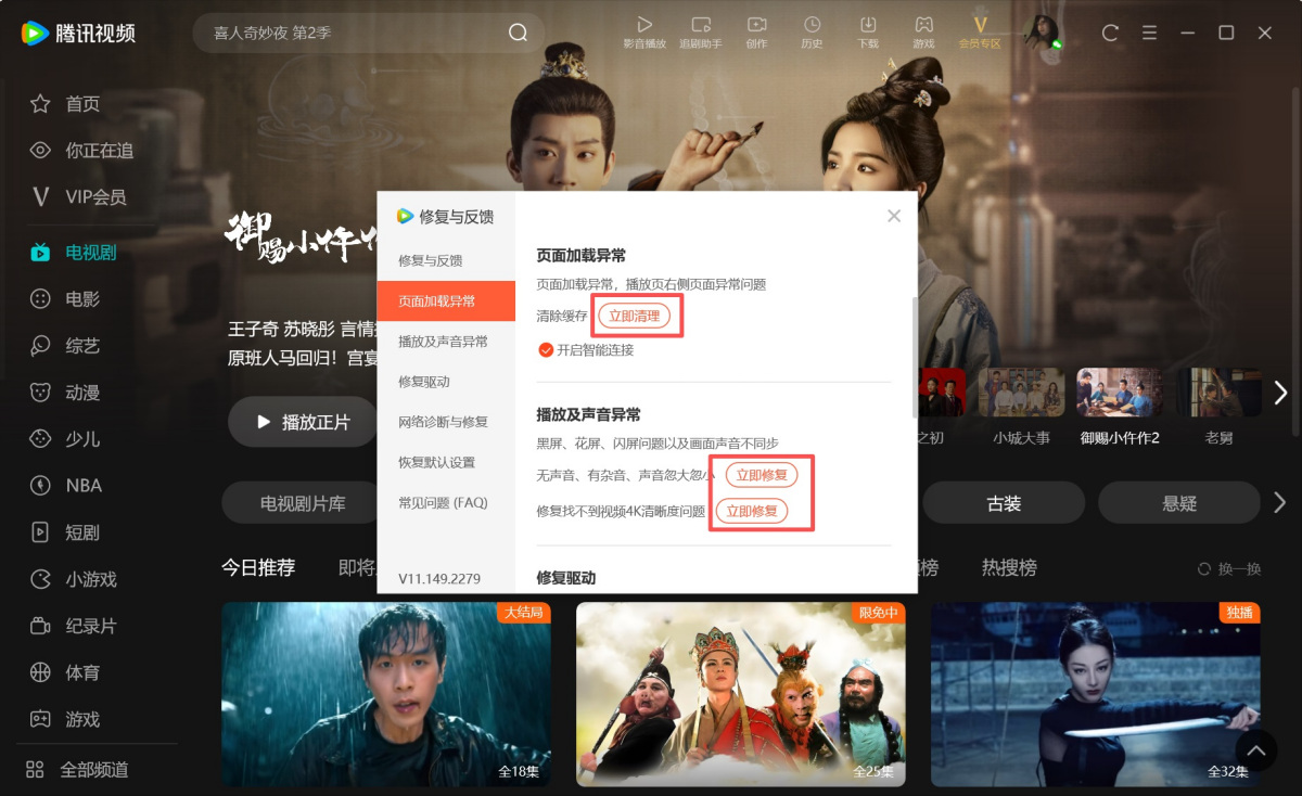 1.如果您遇到页面加载异常、播放及声音异常,或是需要修复驱动、网络诊断等情况,可以点击右上角【≡】,选择【修复与反馈】