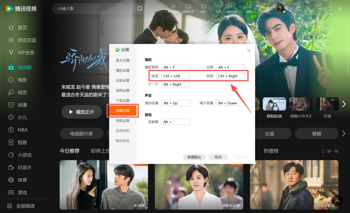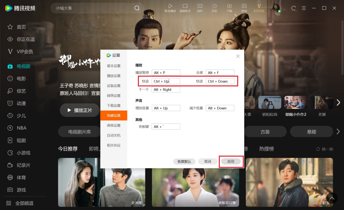 3.若想要修改快捷键,请点击快退、快进后面的方框,按下键盘按键,可直接为您生成快捷键,无需拼出按键名称,设置完成后点击【应用】即可