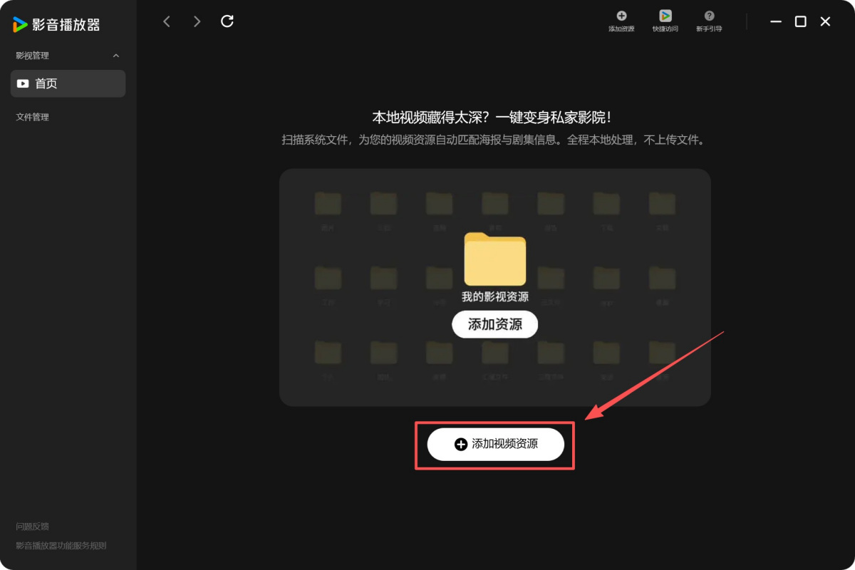 2.弹出【影音播放器】窗口,点击【添加视频资源】后即可观看视频