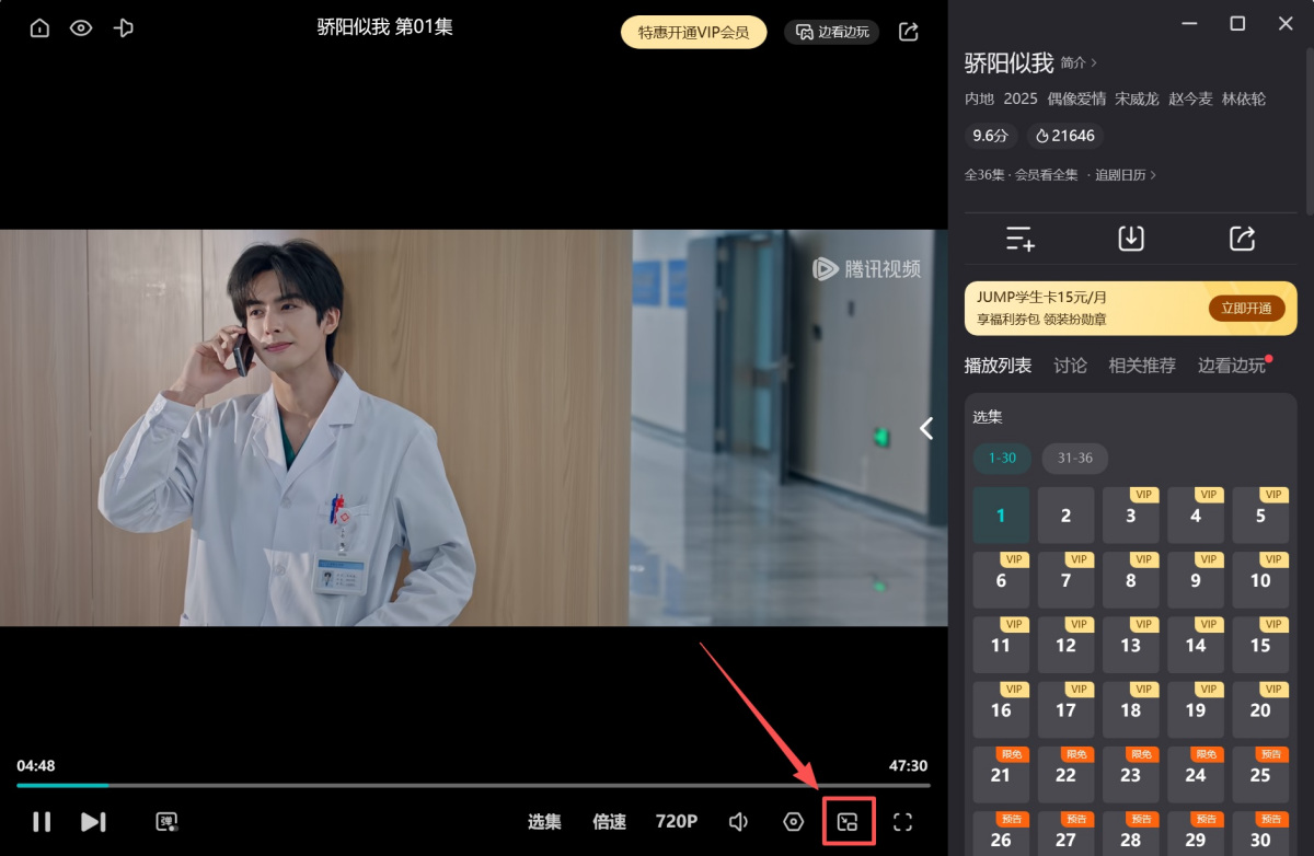 1.进入剧集观看界面,直接点击下图所示的按钮,即可进入小窗模式