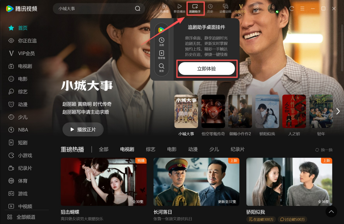 1.打开腾讯视频客户端,将鼠标光标移动到顶部【追剧助手】,弹出窗口后点击【立即体验】