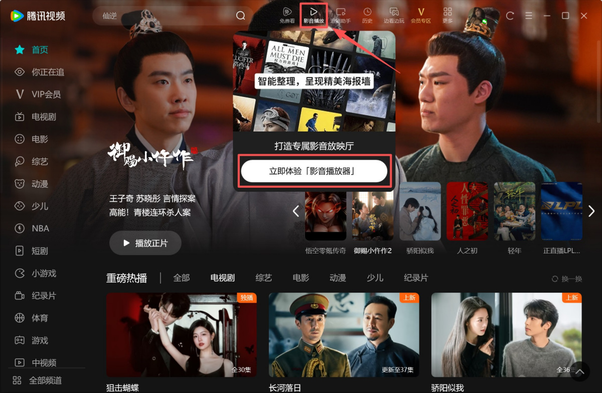 1.打开腾讯视频客户端,将鼠标光标移动到顶部【影音播放】,弹出窗口后点击【立即体验[影音播放器]】