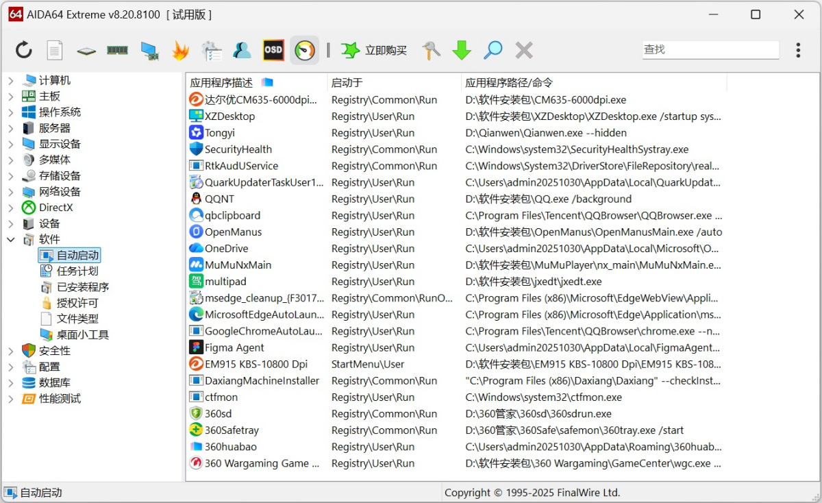 AIDA64 提供超过50页的信息,涵盖已安装程序、软件许可证、安全应用程序和 Windows 设置。此外,还可查看已启动的进程、服务、DLL 文件、开机启动程序以及访问过的网页列表。