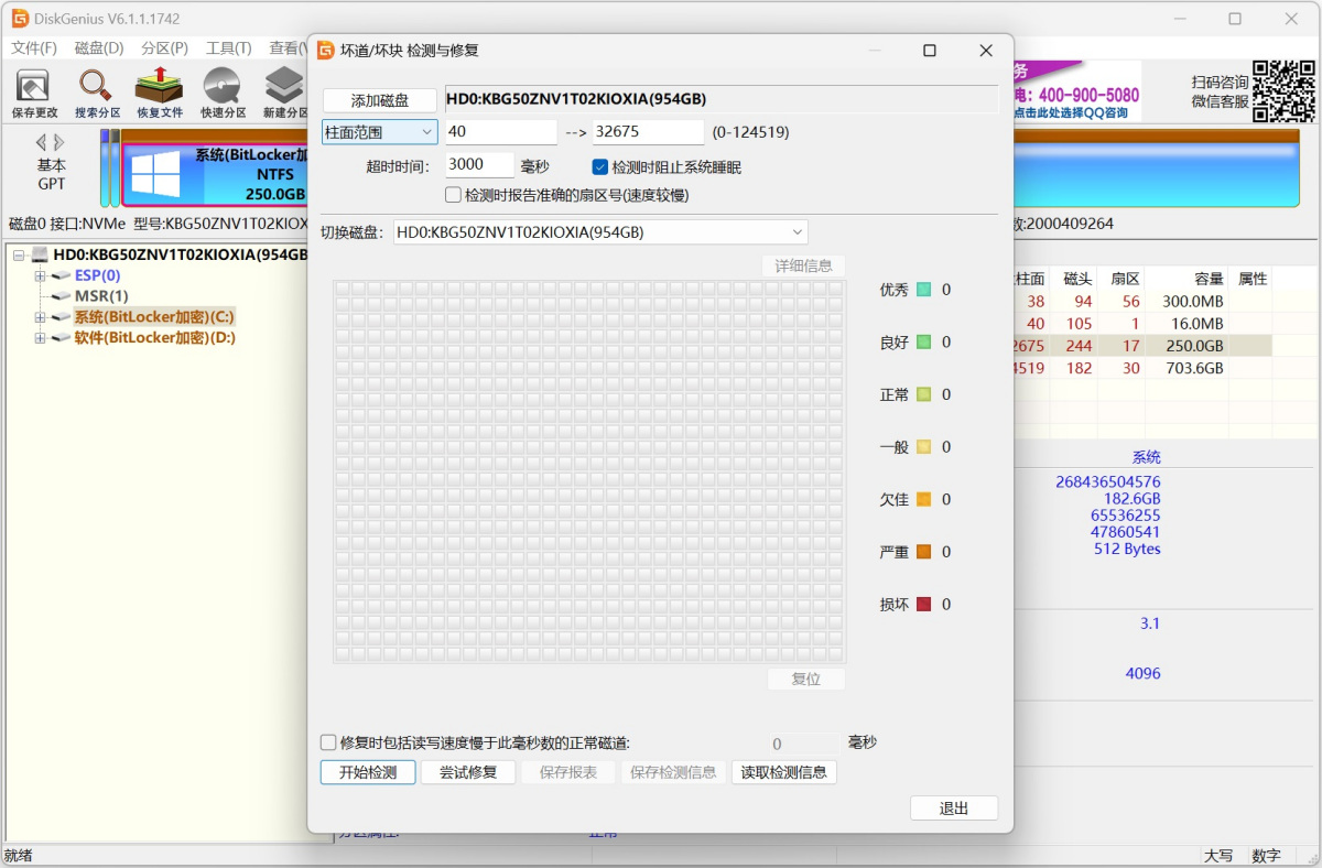 14、优化坏道检测功能,可以指定需检测的容量范围、扇区范围、柱面范围。