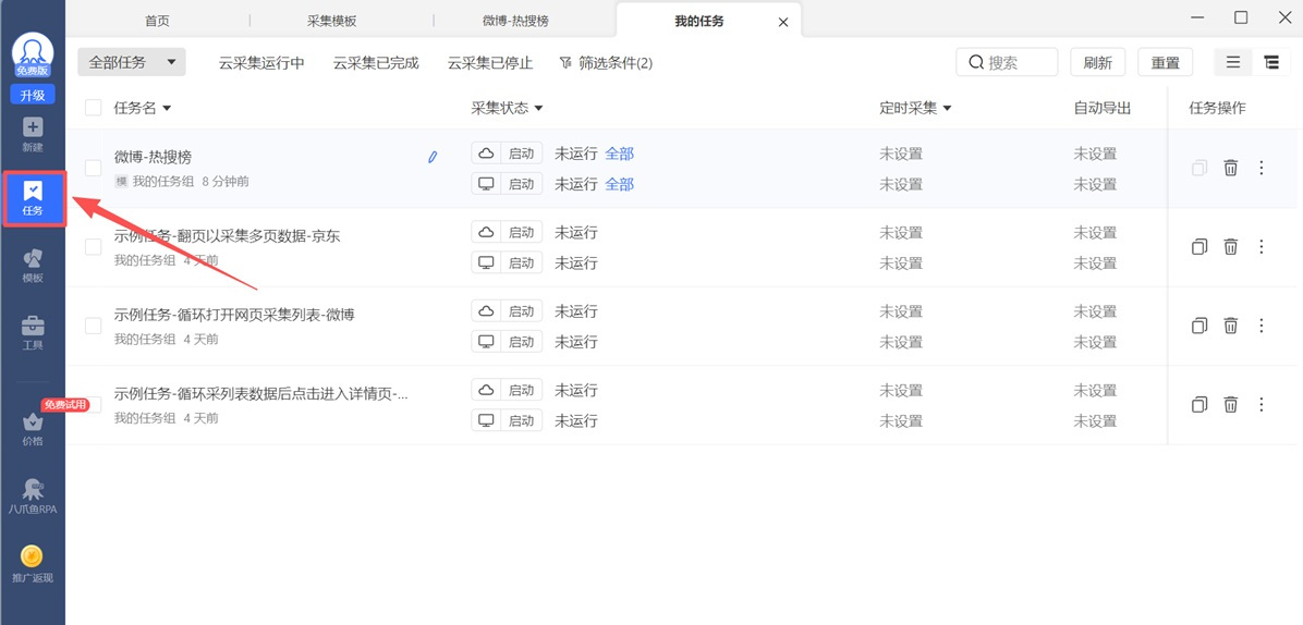 步骤5、通过【采集模板】创建并保存的任务,会放在【我的任务】中。在【我的任务】界面,可以对任务进行多种操作并查看任务采集到的历史数据。