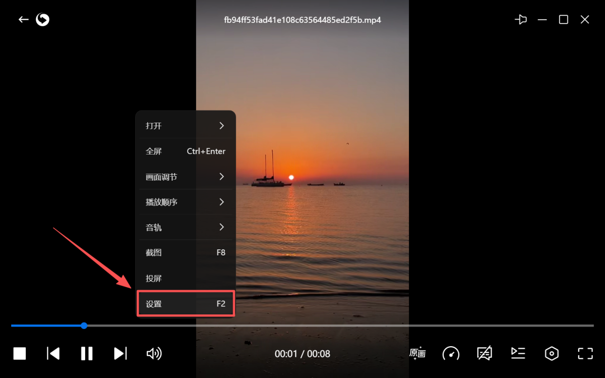 步骤3、如果在播放时需进行设置,按F2或右键鼠标,点击【设置】,再选择【热键】即可。
