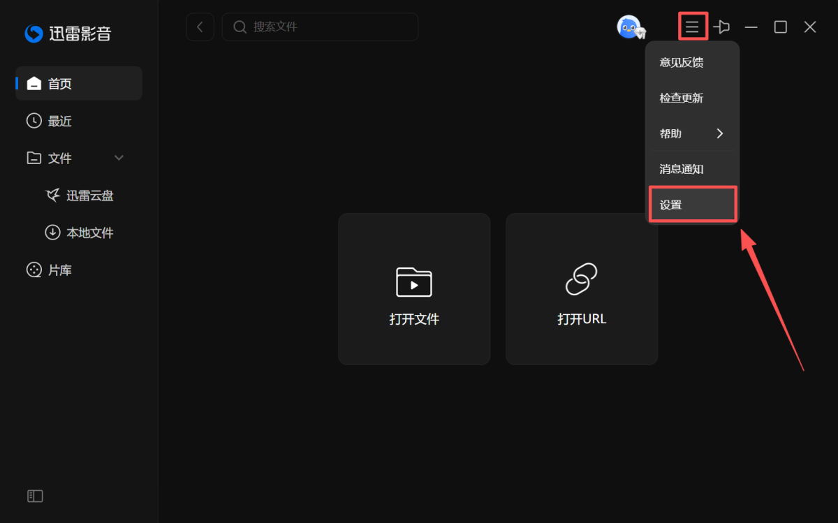 步骤1、在迅雷影音主界面,点击右上角【≡】,选择【设置】;或者直接按F2,打开迅雷影音的系统设置面板。