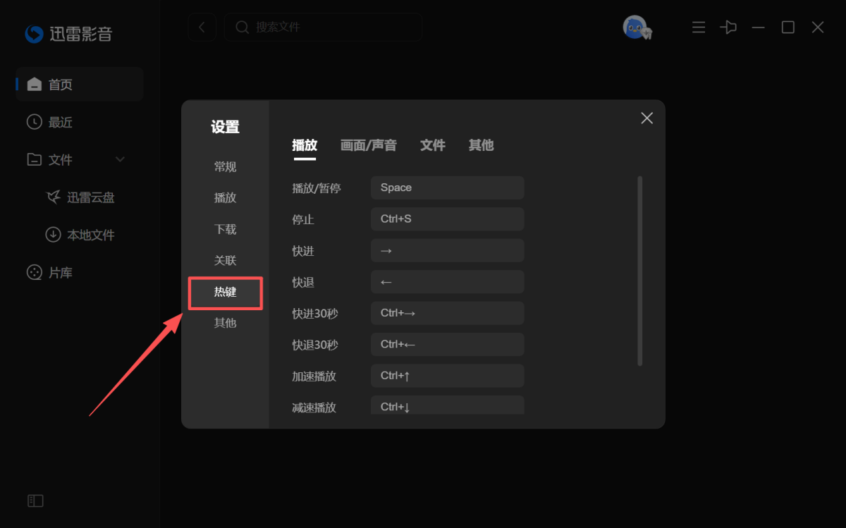步骤2、选择【热键】,迅雷影音常用的热键设置都在这里,可以根据自己的喜好设置。