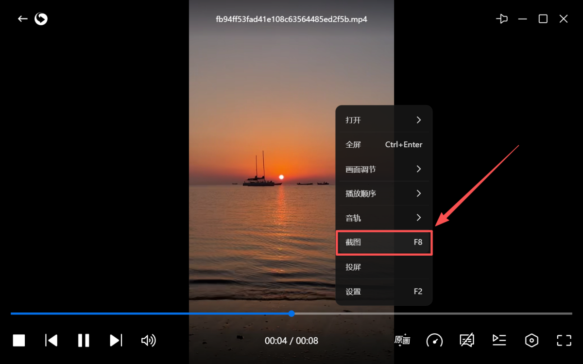 步骤1、进入播放文件,鼠标右键点击【截图】,或者使用快捷键F8快速截图。