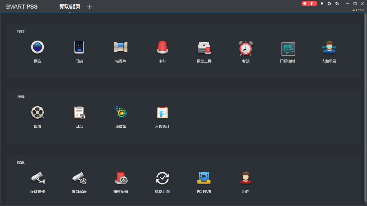 大华smartpss适用于数字硬盘录像机(DVR)、同轴高清数字硬盘录像机(HCVR)、网络视频存储服务器(EVS)、网络硬盘录像机(NVR)、IP摄像机(IPC)、网络球机(SD)和编解码器(NVS)、矩阵、拼接控制器、网络键盘(NKB)、云服务、可视对讲(VTO)、门禁(ASC)等设备,支持实时预览、录像回放/下载、报警信息接收和联动、远程配置设备参数,日志查询、人数统计、门禁控制等多种功能,支持H.265、SVAC和Smart H.264视频预览和回放。