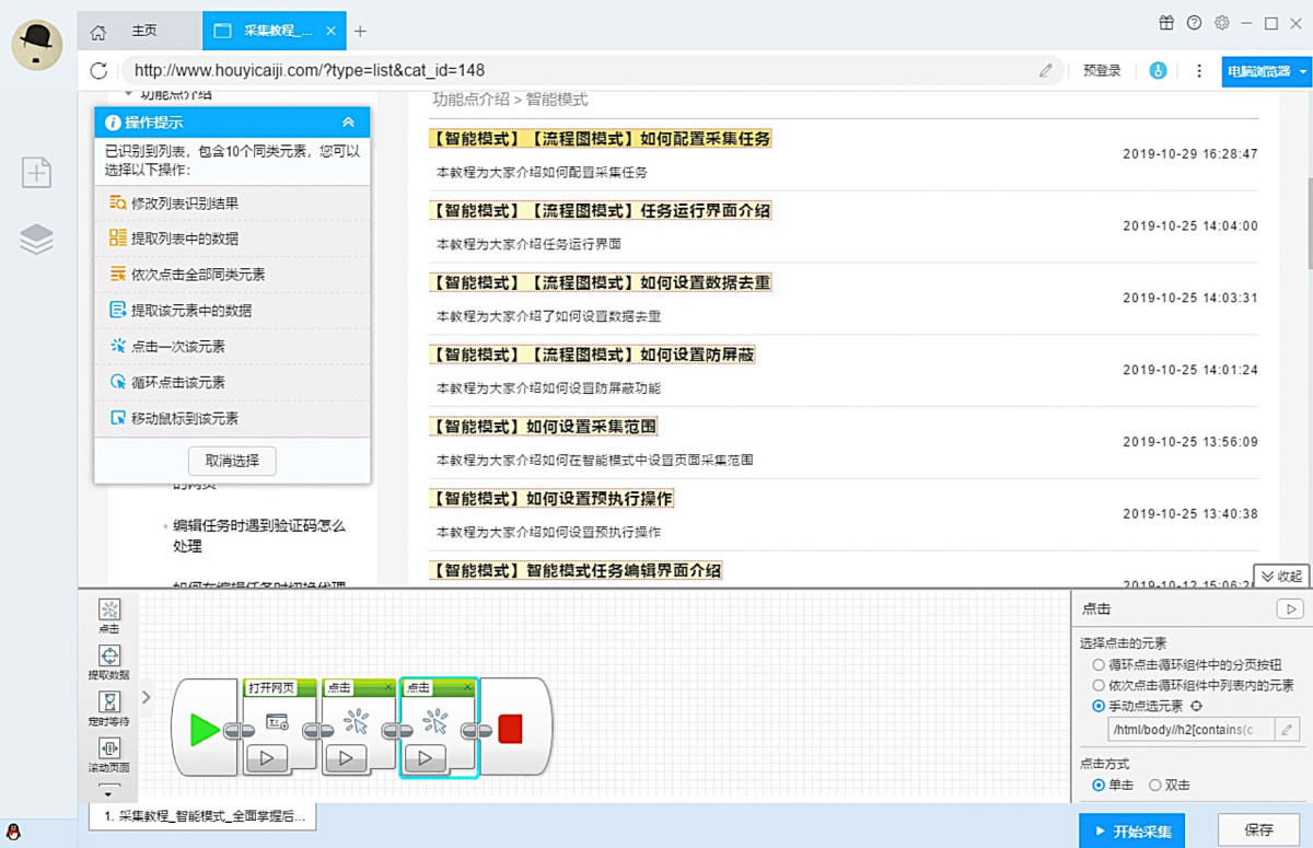 ●流程图模式:只需根据软件提示在页面中进行点击操作,完全符合人为浏览网页的思维方式,简单几步即可生成复杂的采集规则,结合智能识别算法,任何网页的数据都能轻松采集。
