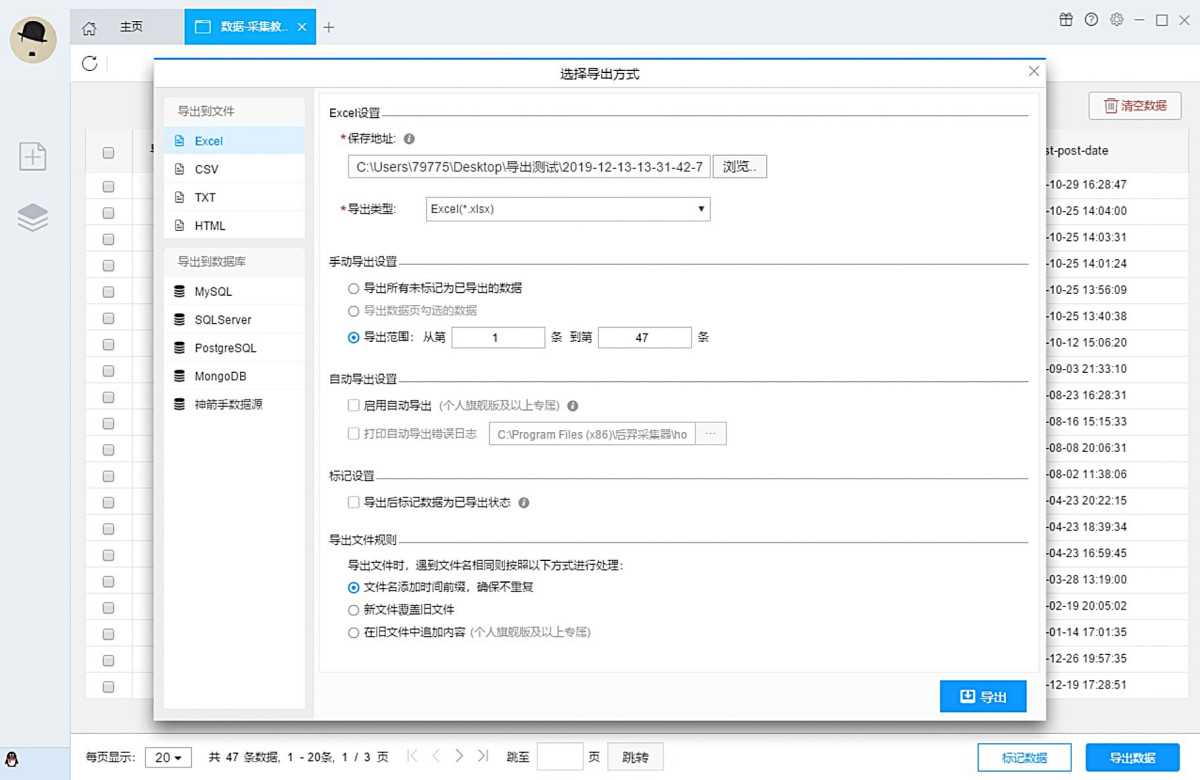 采集结果可以导出到本地,支持TXT、EXCEL、CSV和HTML文件格式,也可以直接发布到数据库(MySQL、MongoDB、SQL Server、PostgreSQL)供您使用。