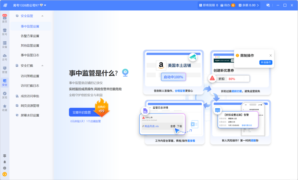 通过安全监管、安全拦截、权限管控、风险操作预警等方式多角度保护店铺安全。