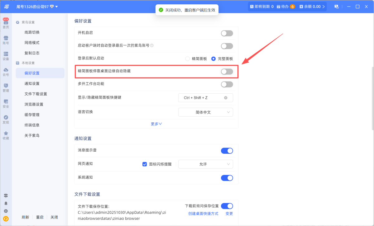 步骤2、选择【偏好设置】,取消勾选【精简面板停靠桌面边缘自动隐藏】,重启客户端后即可生效。