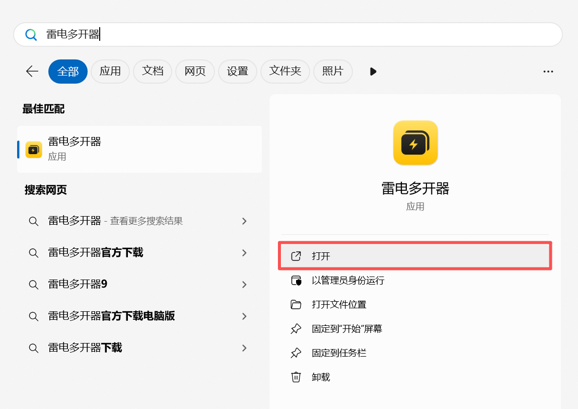 2、在Windows菜单栏中搜索“雷电多开器”,即可快速找到应用程序并启动。