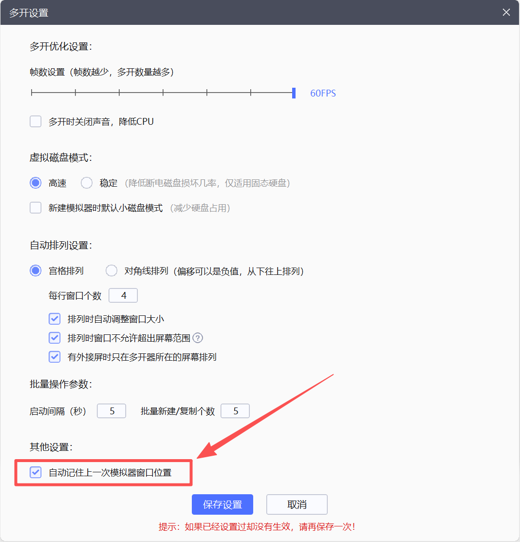 2、进入设置后再界面最下方有一项“自动记住上次模拟器窗口位置”,在前方进行打勾后点击【保存设置】即可。