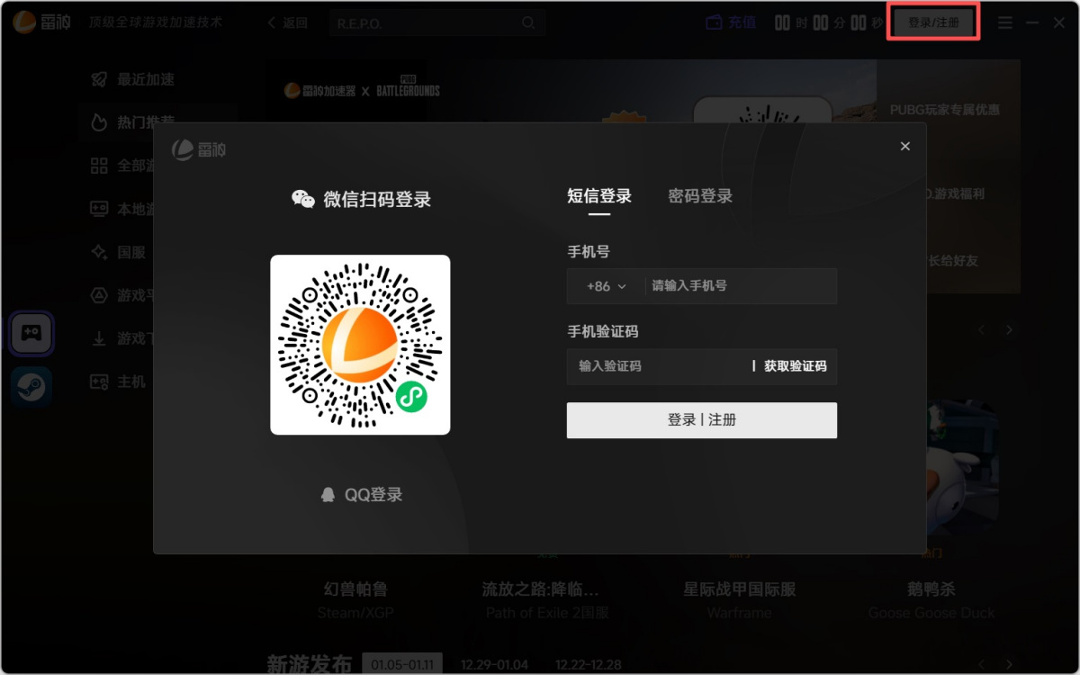 步骤1、打开雷神加速器客户端,点击右上角【登录/注册】进行账号登录