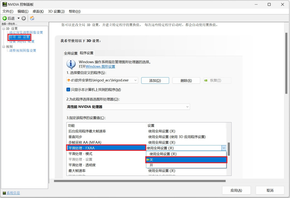 2. 双击【管理3D设置】→【程序设置】→【添加】→【雷神加速器】,关闭【平滑处理-(FXAA)】,然后点击【应用】
