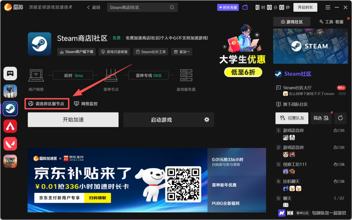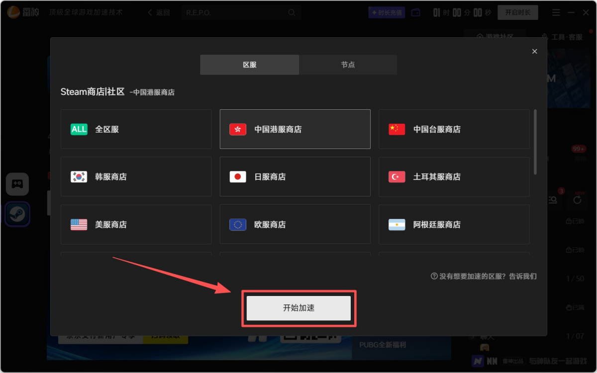 步骤3、加速前请先点击如图所示位置,选择【区服】和【节点】