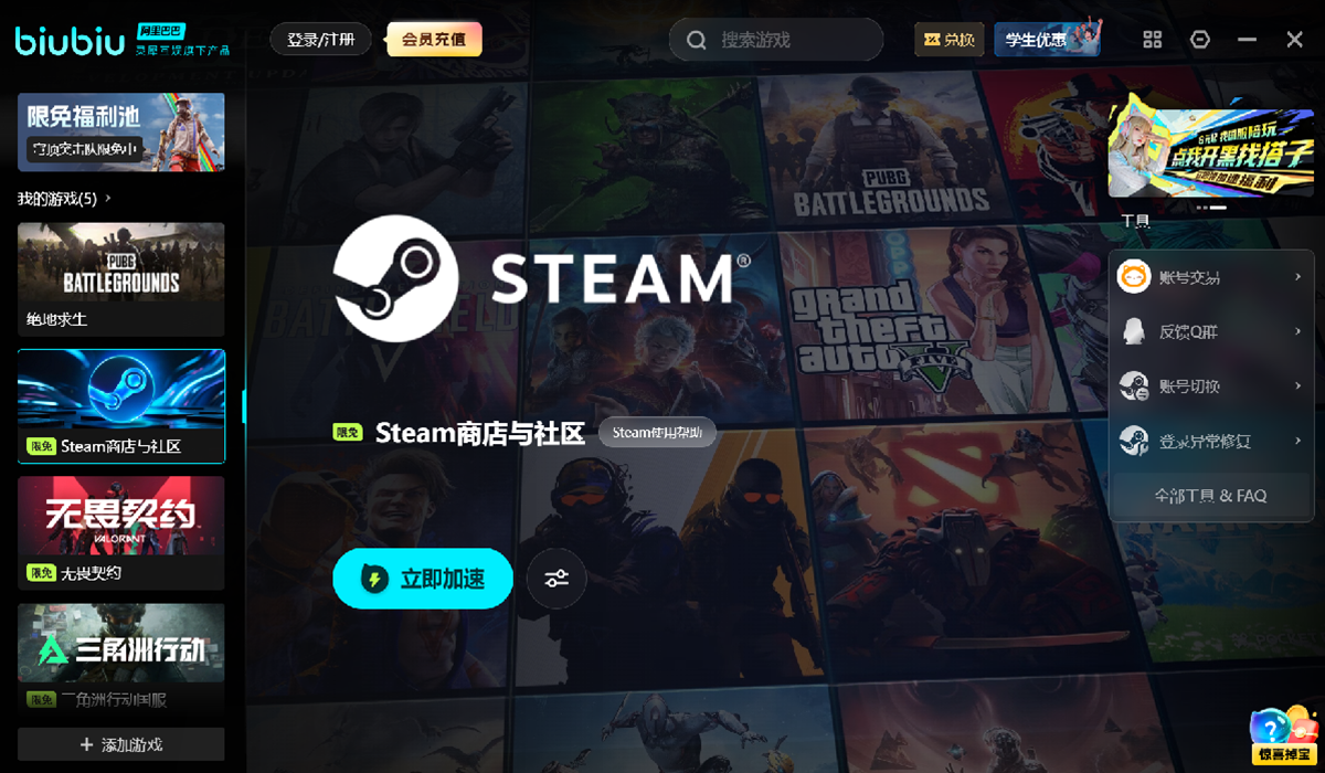 2、专业级游戏加速:支持国内外海量热门游戏,PUBG(绝地求生)、Apex、CS2、英雄联盟、魔兽怀旧服、最终决战、博得之门3、使命召唤系列、艾尔登法环、永劫无间、彩虹6号、战地系列、暗黑破坏神等一键加速,痛快畅玩!